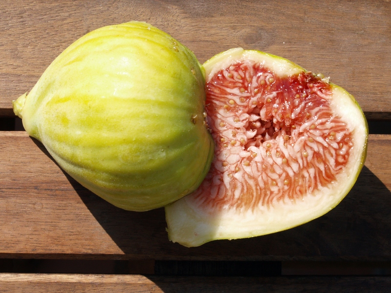 Figues per sota de la mitjana, ovals, amb un coll curt o sense, peduncle prim d’uns 15 mm., ull gran, obert, amb escates de colors brillants, de color groc, carn vermellosa de qualitat bastant bona, no és adequat per al sequer comercial a causa del color de la polpa.